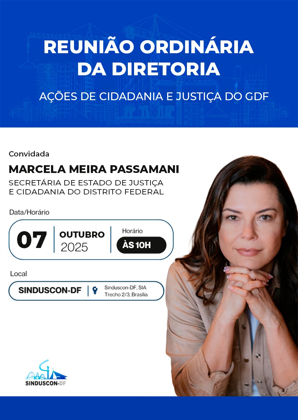Reunião ordinária da diretoriaconvidada: Marcela Meira PassamaniSecretária de Estado de Justiça e Cidadania do Distrito FederalData: 07/10/2025 – 10hSinduscon-DF